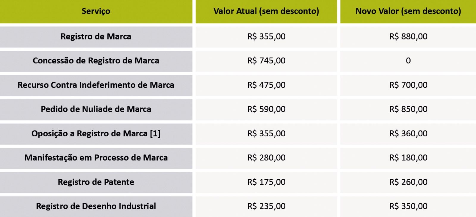 As alterações, que representam um reajuste médio de 24,1%, incluem a extinção da taxa de concessão de registro de marca, que agora passará a ser integrada ao valor inicial do pedido de registro, além disso, estabeleceu-se a concessão de descontos de 50%, para a maioria dos serviços, voltados para pessoas físicas, microempresas, MEIs e outras entidades sem fins lucrativos.